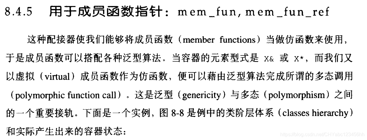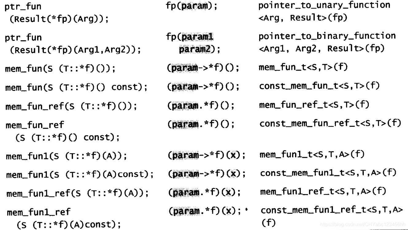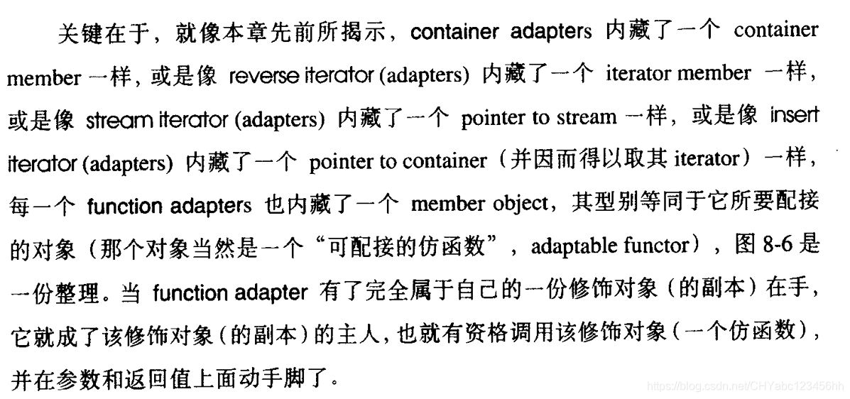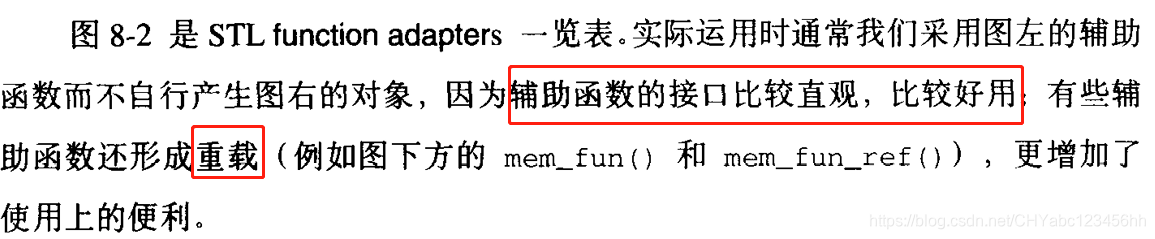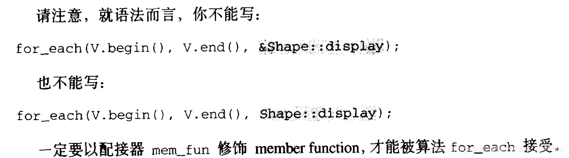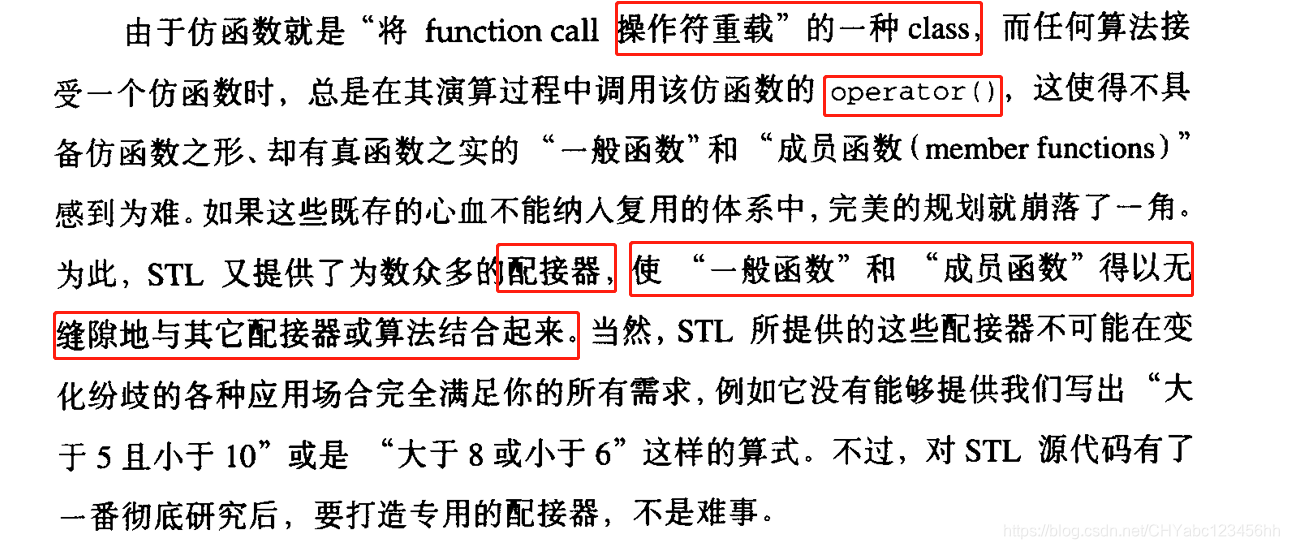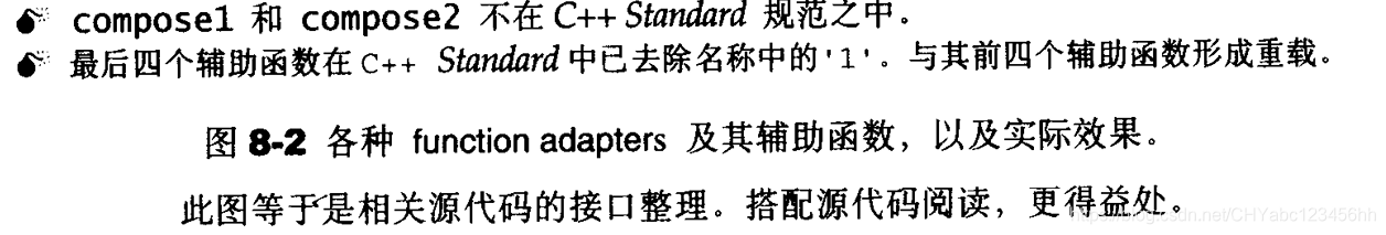 - 请注意,所有期望获得配接能力的组件,本身都必须是可配接的(adaptable) 换句话说,一元仿函数必须继承自unary_function (7.1.1节 ),二元仿函数必须继承自binary_function (7.1.2 节 ) ,成员函数必须以mem_fun处理过,一般函数必须以ptr_fun处理过。一个未经ptr_fun处理过的一般函数,虽然也可以函 数指针(pointer to function)的形式传给STL算法使用 却无法拥有任何配接能力。