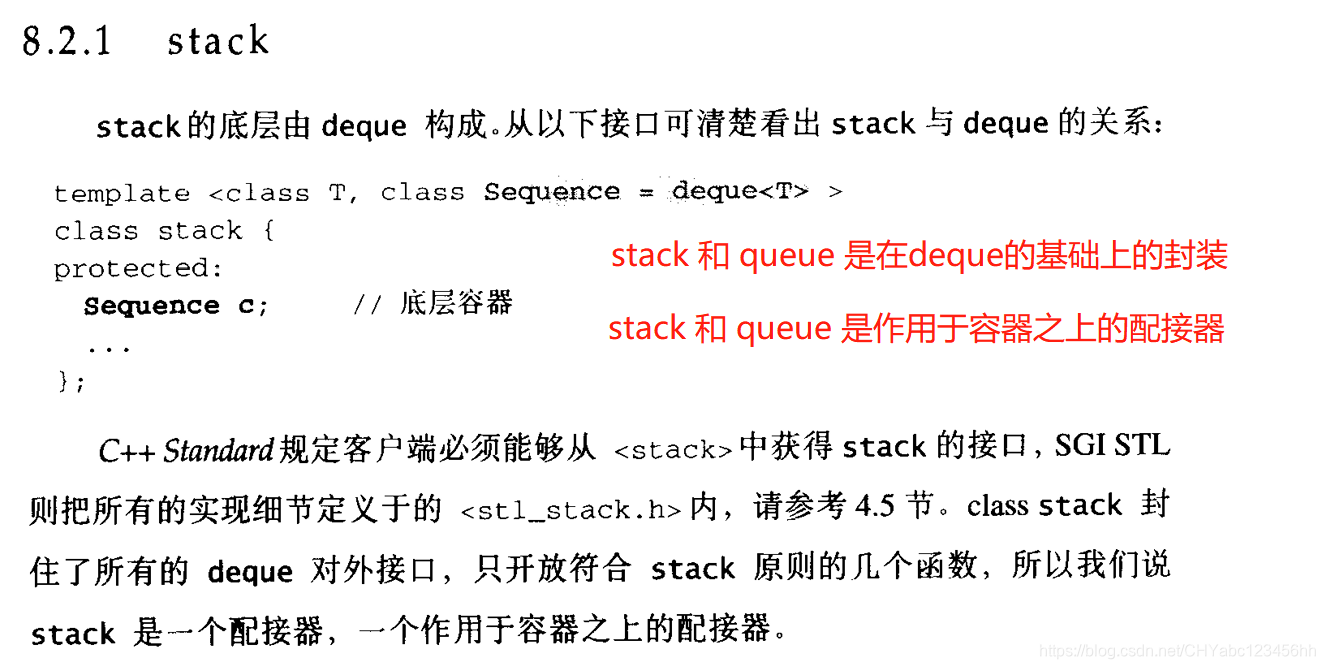 - C++ standard 规定客户端必须能够从<stack>中获得stack的接口,SGI STL 则把所有的实现细节定义于的<stl_stack.h>内,请参考4.5节。class stack封住了所有的deque对外接口,只开放符合stack原则的几个函数,所以我们说 stack是一个配接器,一个作用于容器之上的配接器。