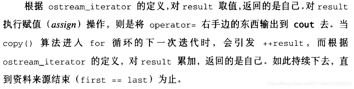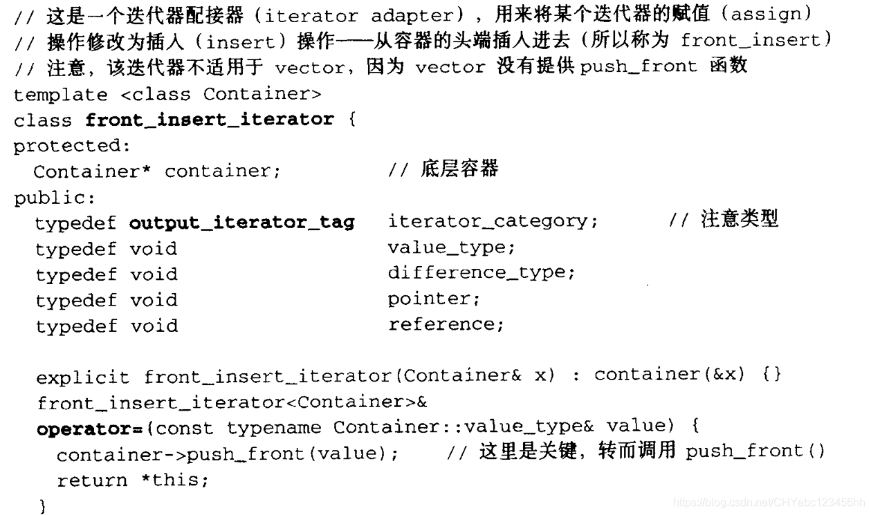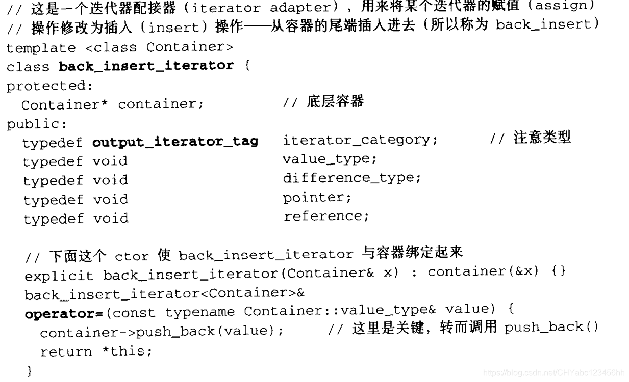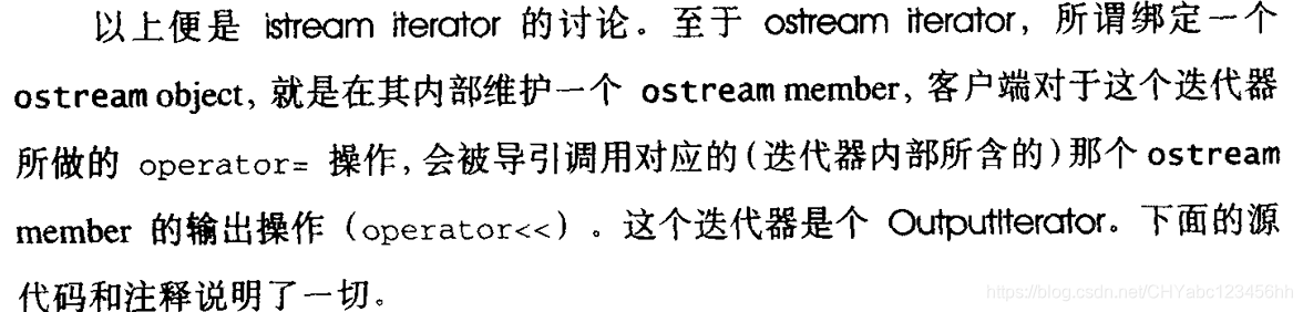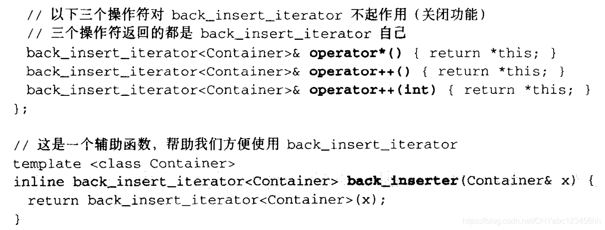 - 至 于 其 它 的 迭 代 器 惯 常 行 为 如 operator++, operator++ (int) operator*都被关闭功能,更 没 有 提 供 operator-- (int)或 operator--或 operator->等功能(因此被类型被定义为output„iterator_tag)