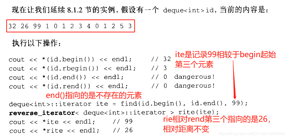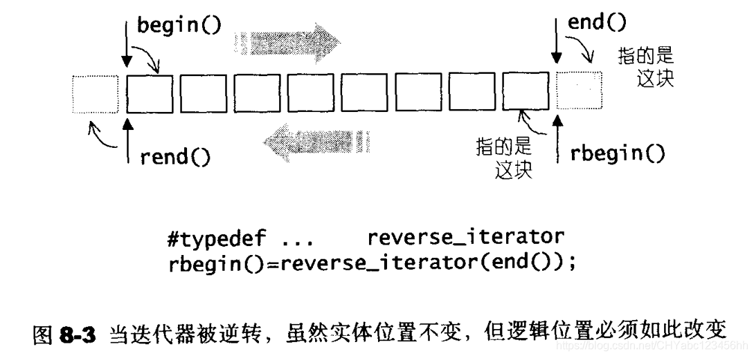 - 为什么 “正向迭代器”和 “与其相应的逆向迭代器”取出不同的元素呢?这并不是一个潜伏的错误,而是一个刻意为之的特征,主要是为了配合迭代器区间的“前闭后开”习 惯 (1.9.5节 ) . 从图8-3的 rbeginO和 end()关系可以看出, 当迭代器被逆转方向时,虽然其实体位置(真正的地址)不变,但其逻辑位置(迭代器所代表的元素)改变了(必须如此改变):