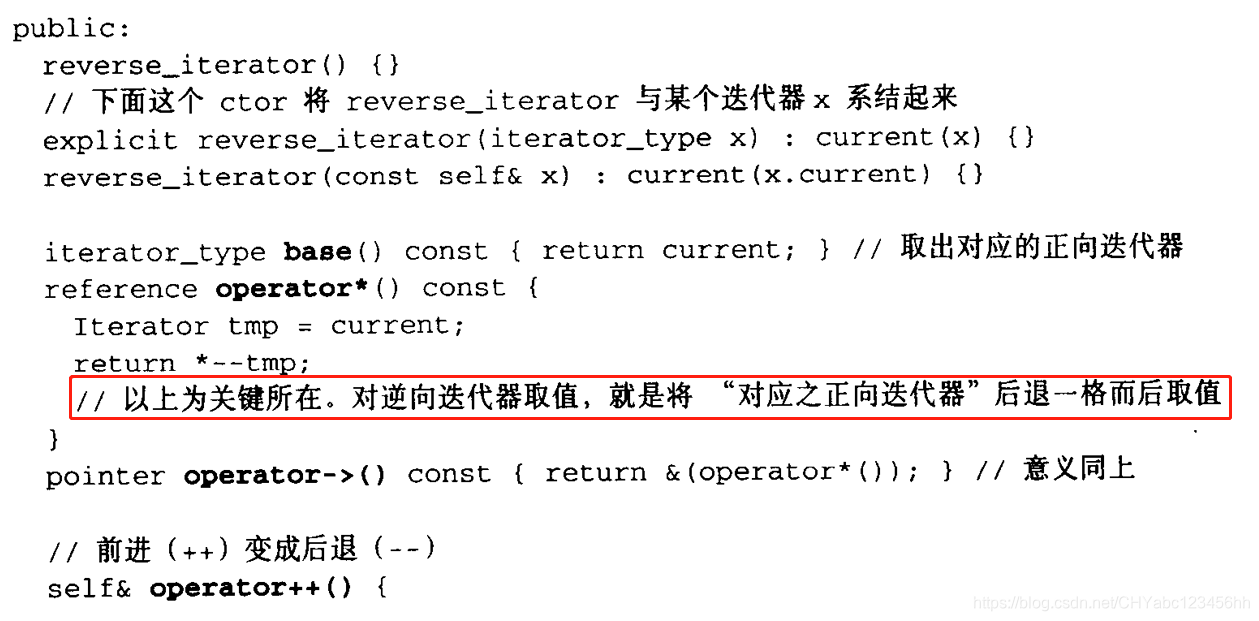 - 唯有这样,才能保持正向迭代器的一切惯常行为。换句话说,唯有这样,当我们将一个正向迭代器区间转换为一个逆向迭代器区间后,不必再有任何额外处理,就可以让接受这个逆向迭代器区间的算法,以相反的元素次序来处理区间中的每一个元素.例如(以下出现于8.1.2节实例之中):