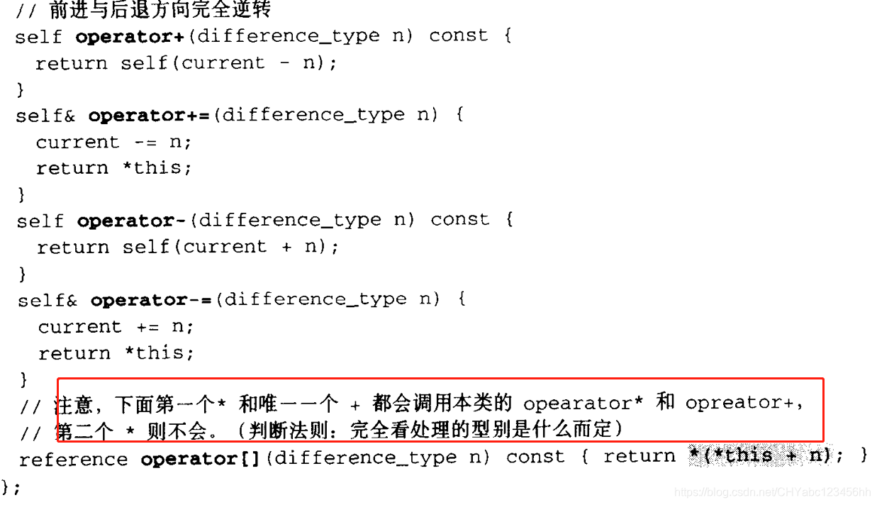 - 所谓reverse iterators,可以将一般迭代器的行进方向逆转,使原本应该前进的 operator++ 变成了后退操作,使原本应该后退的 operator-- 变成了前进操作。 这种错乱的行为不是为了掩人耳目或为了欺敌效果,而是因为这种倒转筋脉的性质运用在“从尾端开始进行”的算法上,有很大的方便性• 稍后我有一些范例展示