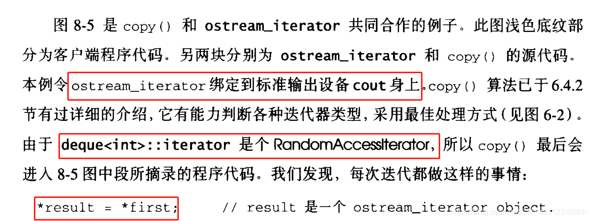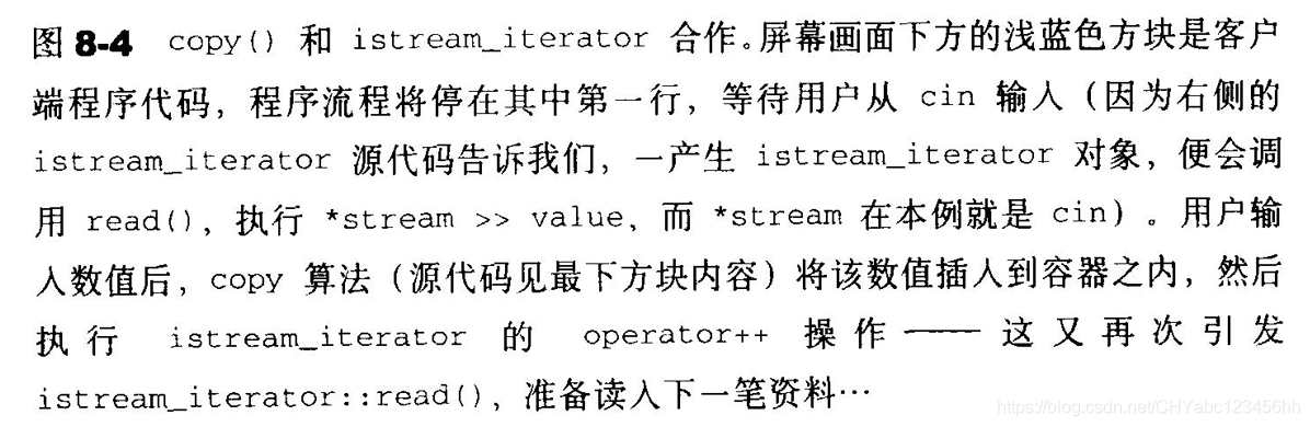 };int main(int argc,char* argv[]){//将 outite绑定到cout 每次对outite指派一个兀素,就后接一个 ""std::ostream_iterator<int>outite(std::cout," ");int ia[] = {0,1,2,3,4,5};std::deque<int>id(ia,ia+6);//将所有元素拷贝到outite (那么也就是拷贝到cout)std::copy(id.begin(),id.end(),outite); //输出 0 1 2 3 4 5std::cout << std::endl;// 将 ia []的部分元素拷贝到id 内。使 用 front_insert_iterator<>// 注意,front_insert_iterqtor 会将 assign 操作改为 push_front 操作// vector不支持push_front (),这就是本例不以vector为示范对象的原因。std::copy(ia+1,ia+2,std::front_inserter(id));std::copy(id.begin(),id.end(),outite); //输出 1 0 1 2 3 4 5std::cout << std::endl;//将 ia []的部分元素拷贝到i d 内。使 用 back_insert_iterator.std::copy(ia+3,ia+4,std::back_inserter(id));std::copy(id.begin(),id.end(),outite); //输出 1 0 1 2 3 4 5 3std::cout << std::endl;//搜索元素 5 所在的位置std::deque<int>::iterator ite = std::find(id.begin(),id.end(),5);//将 ia[]的部分元素拷贝到i d 内。使 用 insert_iteratorstd::copy(ia+0,ia+3,std::inserter(id,ite));std::copy(id.begin(),id.end(),outite); //输出 1 0 1 2 3 4 0 1 2 5 3std::cout << std::endl;//将所有的元素逆向拷贝//rbegin ()和 rend ()与 reverse_iterator有关,见稍后源代码说明std::copy(id.rbegin(),id.rend(),outite);std::cout << std::endl;//以下,将inite绑定到cin.将元素拷贝到inite,直到eos出现std::istream_iterator<int>inite(std::cin),eos;//eos :end-of-streamstd::copy(inite,eos,std::inserter(id,id.begin()));// 由于很难在键盘上直接输入end-of-stream (end-of-file)符号// (而且不同系统的eof符号也不尽相同),因此,为了让上一行顺利执行,// 请单独取出此段落为一个独立程序,并准备一个文件,例 如 int.dat,内置 // 32 26 99 (自由格式),并 在 console之下利用piping方式执行该程序,如下:// c :\>type int.dat I thisprog / / 意思是将type int .dat的结果作为thisprog的输入std::copy(id.begin(),id.end(),outite);return 0;