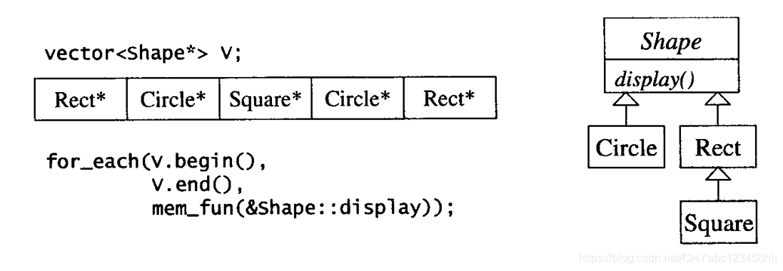 };int main(int argc,char* argv[]){std::vector<Shape*>Iv{};Iv.push_back(new Rect);Iv.push_back(new Circle);Iv.push_back(new Square);Iv.push_back(new Circle);Iv.push_back(new Rect);//打印 输出for (int i = 0; i < Iv.size(); ++i) {(Iv[i])->display();}std::cout << std::endl;std::for_each(Iv.begin(),Iv.end(),std::mem_fun(&Shape::display));std::cout << std::endl;return 0;