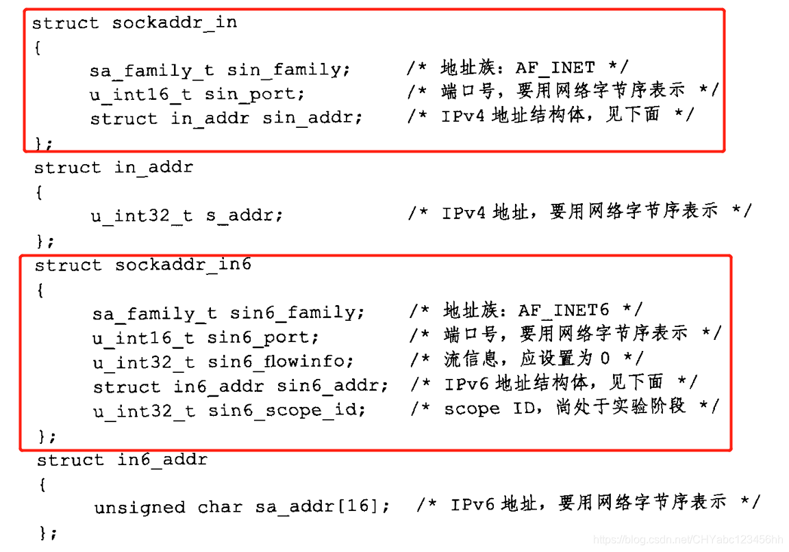 - TCP/IP协议族有sockaddr_in和 sockaddr_in6两个专用socket地址结构体,它们分别用 于 IPv4 和 IPv6