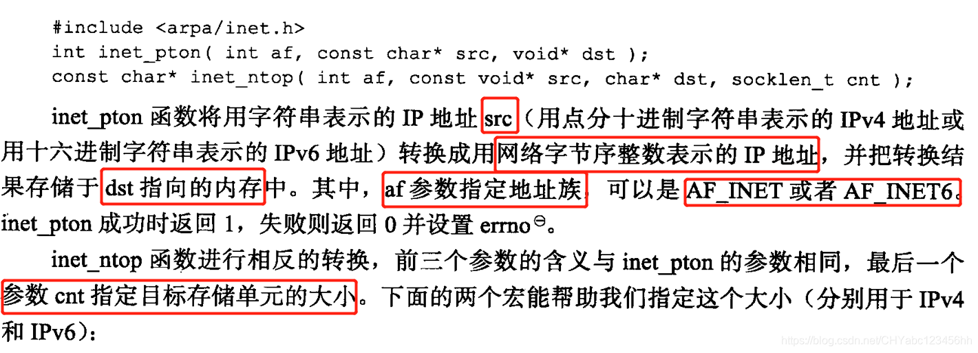 - inet_ntop成功时返回目标存储单元的地址,失败则返回NULL并设置ermo