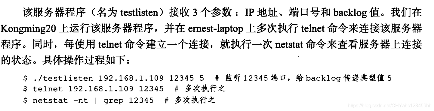 - 我们改变服务器程序的第3个参数并重新运行之,能发现同样的规律,即完整连接最多有(backlog+1)个。在不同的系统上,运行结果会有些差 别,不过监听队列中完整连接的上限通常比backlog值略大。