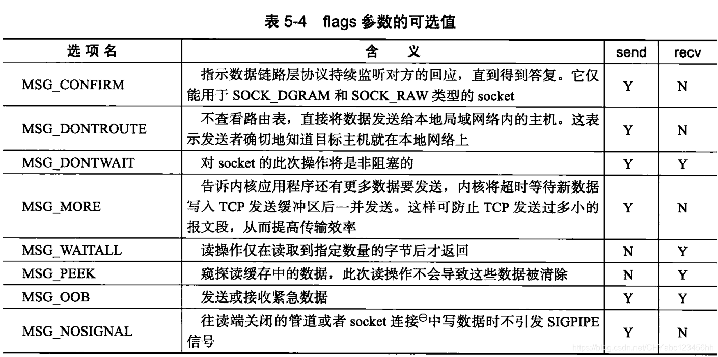 - flags参数为数据收发提供了额外的控制,它可以取表所示选项中的一个或几个的逻辑或