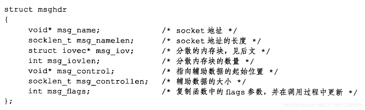 - sockfd参数指定被操作的目标socket,msg参数是msghdr结构体类型的指针,msghdr结构体的定义如下所示