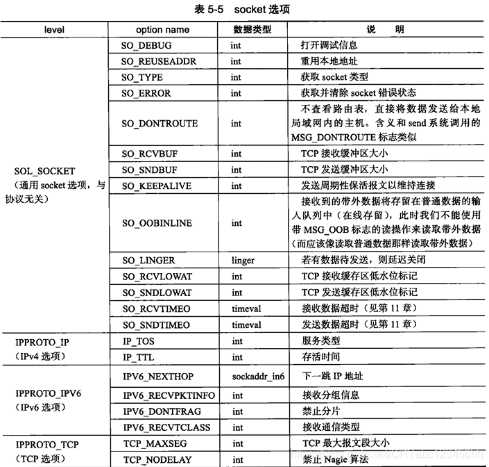 比如IPv4、IPv6、TCP等。option_iiame参数则指定选项的名字。我们在表5-5中列举了socket通信中几个比较常用的socket选项。option value和 option len参数分别是被操作选项