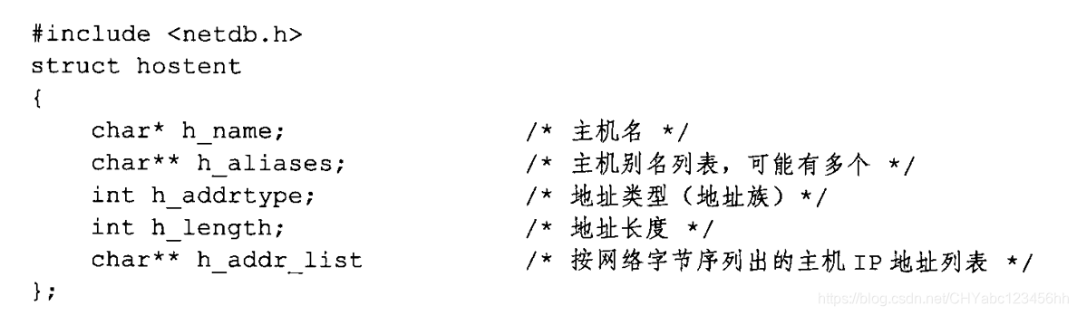 - 这两个函数返回的都是hostent结构体类型的指针,hostent结构体的定义如下: