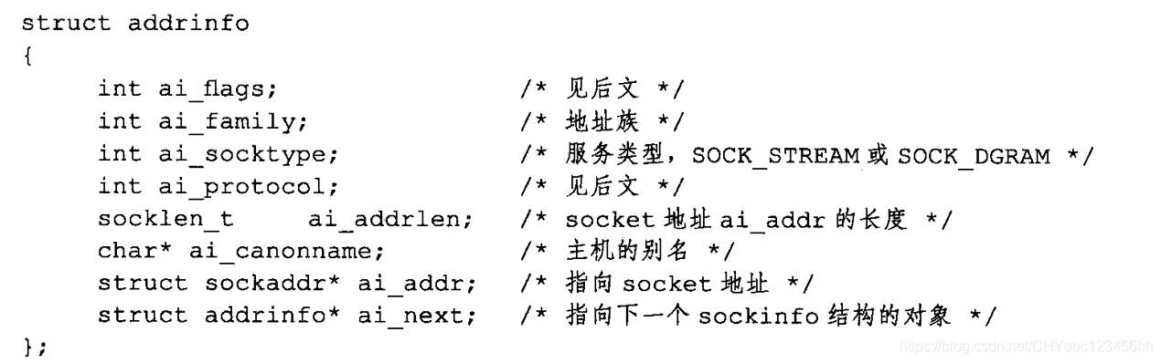 - getaddrinfo反馈的每一条结果都是addrinfo结构体类型的对象,结构体addrinfo的定义如下: