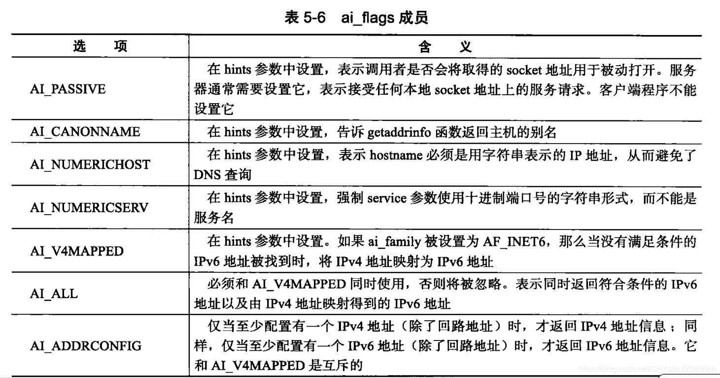 - 该结构体中,ai_protocol成员是指具体的网络协议,其含义和socket系统调用的第三个 参数相同,它通常被设置为0。ai_flags成员可以取表5-6中的标志的按位或。