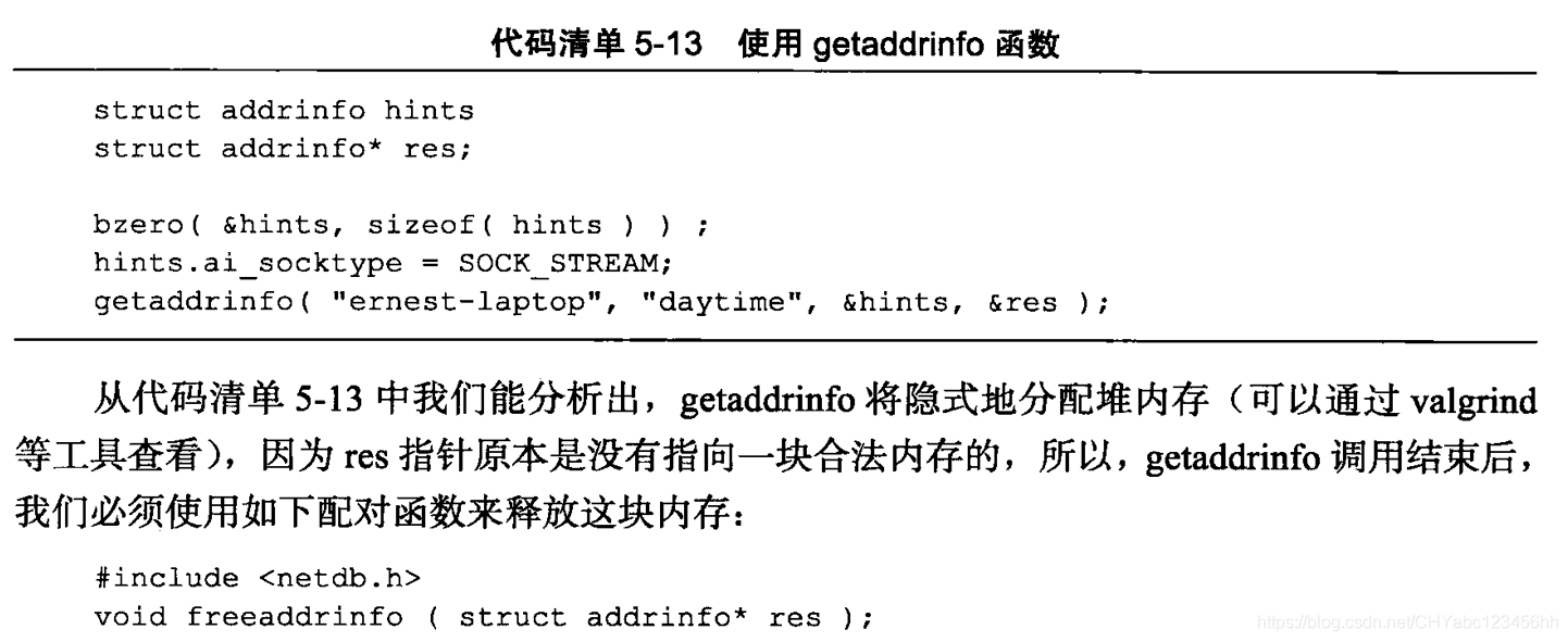 - 当我们使用hints参数的时候 ,可以设置其ai_flags, ai_family, ai_socktype和 ai_protocol四个字段,其他字段则必须被设置为NULL。例如,代码清单 13利用了 hints参数获取主机emest-laptop 上的 "daytime” 流服务信息
