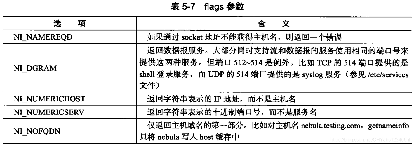 - getnameinfo将返回的主机名存储在host参数指向的缓存中,将服务名存储在serv 参数指向的缓存中,hostlen和 servlen参数分别指定这两块缓存的长度。Hags参数控制 getnameinfo的行为,它可以接收表5-7中的选项。