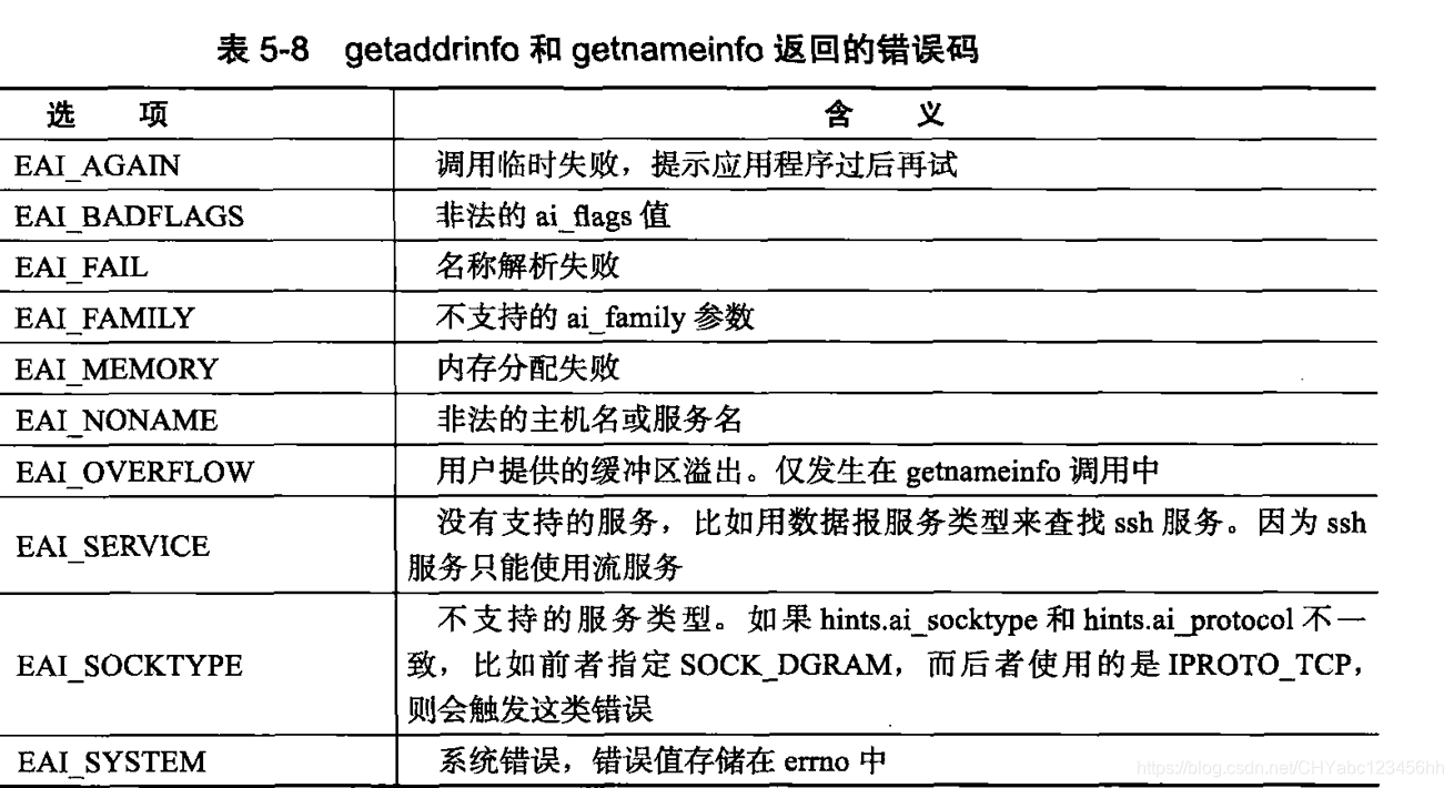 - getaddrinfo和 getnameinfo函数成功时返回0 , 失败则返回错误码,可能的错误码如表 所示