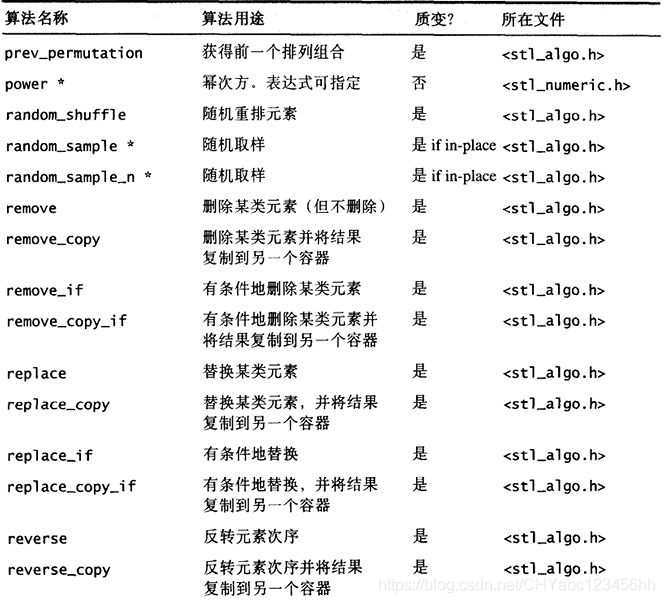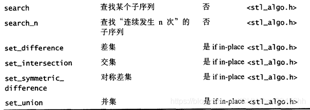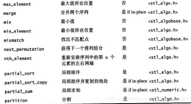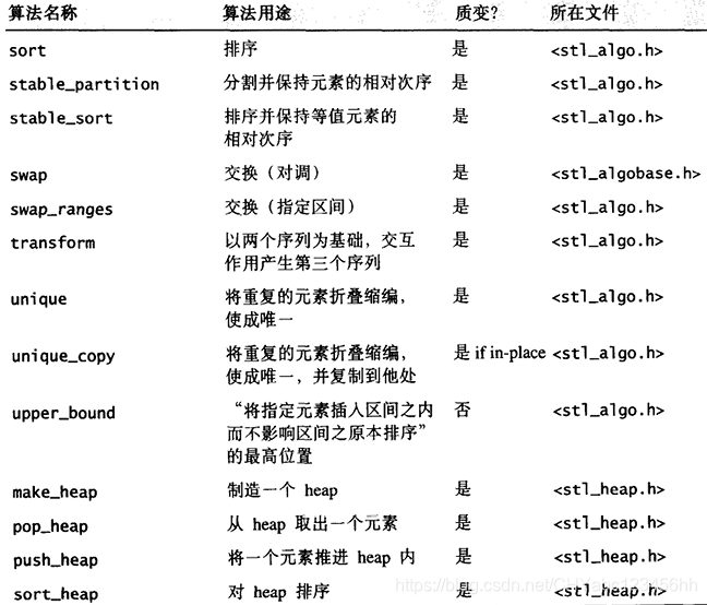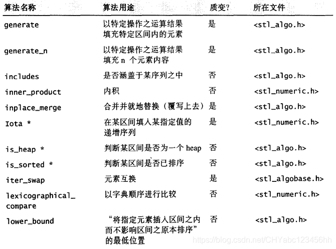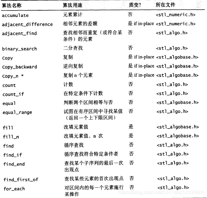 另一个版本提供额外参数,接受外界传入一个仿函数(functor), 以便采用其他策略。例如 unique() 缺省情况下使用equality操作符来比较两个相邻元素,但如果这些元素的型别并未供应equality操作符,或如果用户希望定义自己的equaHty 操作符,便可以传一个仿函数(fimctor)给另一版本的 unique () 有些算法干脆将这样的两个版本分为两个不同名称的实体,附从的那个总是以作为尾词,例如 find_if (). 另一个例子是replace ( ) , 使用内建的equality操作符进行比对操作,replace_if()则以接收到的仿函数(functor)进行比对行为 - 所有的数值(numeric)算法,包括 adjacent_dif ference () , accumulate (), inner_product () , partial_sum( ) 等等,都实现于 SGI <stl_numeric ,h> 之中,这是个内部文件,S T L 规定用户必须包含的是上层的〈numeric〉。其他STL 算法都实现于SGI的 <stl_algo.h>和<stl_algobase.h>文件中,也都是内部文件;欲使用这些算法,必须先包含上层相关头文件<algorithm>