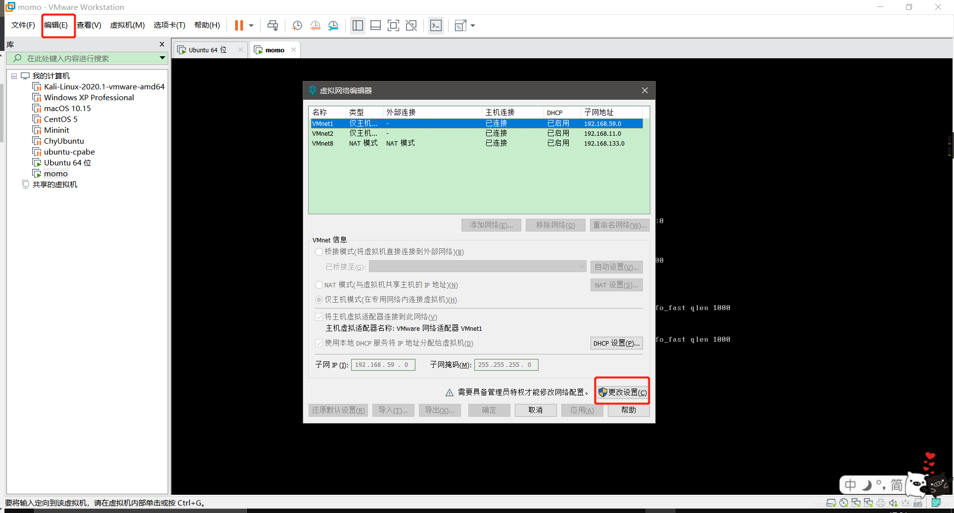 - 点击编辑 进入虚拟网络编辑器 点击更改设置