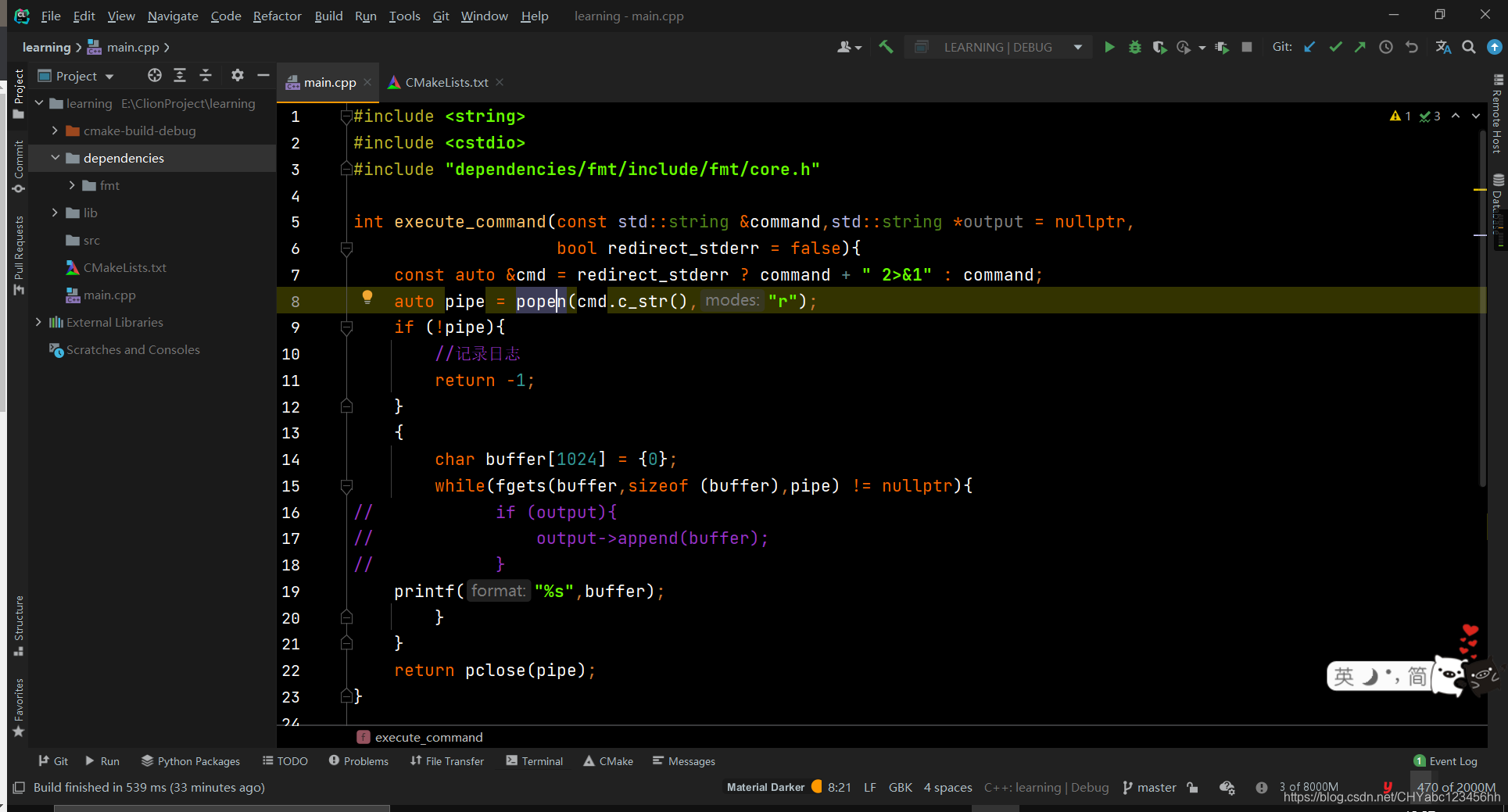 #include "dependencies/fmt/include/fmt/core.h"int execute_command(const std::string &command,std::string *output = nullptr,bool redirect_stderr = false){const auto &cmd = redirect_stderr ? command + " 2>&1" : command;auto pipe = popen(cmd.c_str(),"r");if (!pipe){//记录日志return -1;}{char buffer[1024] = {0};while(fgets(buffer,sizeof (buffer),pipe) != nullptr){