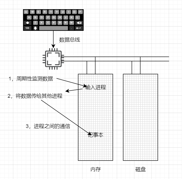 - 键盘输入程序,引发控制总线的中断,中断会触发中断处理程序,中断处理程序会从数据总线获取数据,将数据传给其他进程