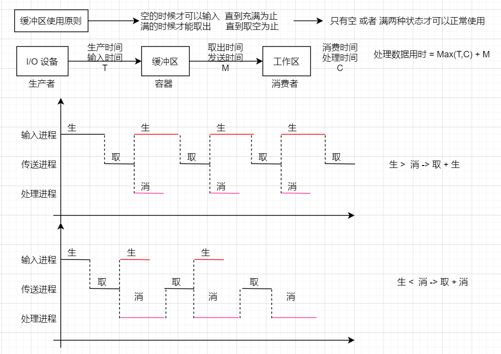 - 生产时间 < 消费时间 -> 处理一块缓存区数据的平均时间 = 取用时间 + 消费时间