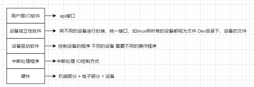 - 设备独立性软件 ->将不同的设备进行封装,统一接口,如linux将所有的设备都视为文件 Dev目录下,设备的文件