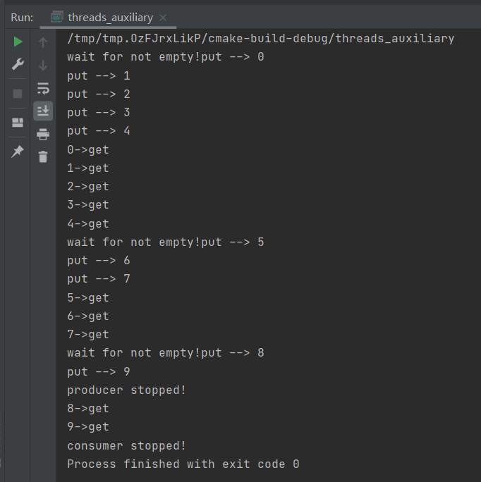 }void * producer(void *data){for (int i = 0; i < 10; ++i) {printf("put --> %d\n",i);put(&buffer,i);}put(&buffer,OVER);printf("producer stopped!\n");return nullptr;