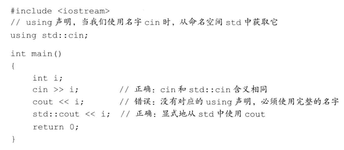- 有了using声明就无须专门的前缀(形如命名空间::)也能使用所需的名字了。using声明具有如下的形式:
