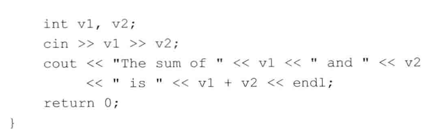 - 按照规定,每个using声明引入命名空间中的一个成员。例如,可以把要用到的标准库中的名字都以using声明的形式表示出来,重写1.2节 (第 5 页)的程序如下:
