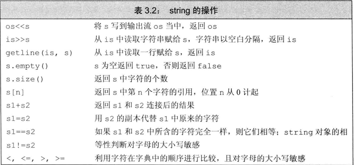 - 一个类除了要规定初始化其对象的方式外,还要定义对象上所能执行的操作。其中,类既能定义通过函数名调用的操作,就像Sales_item类的isbn函数那样(参见1.5.2节,第20页),也能定义<<、+等各种运算符在该类知象上的新含义。表3.2中列举了string的大多数操作。
