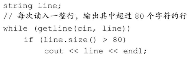 - 在上面的程序中,if语句的条件部分使用了逻辑非运算符(!),它返回与其运算对象相反的结果。此例中,如果str不为空则返回真。size函数返回string对象的长度(即string对象中字符的个数),可以使用size函数只输出长度超过80个字符的行: