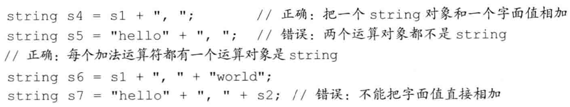 - 当把string对象和字符字面值及字符串字面值混在一条语句中使用时,必须确保每个加 法运算符( + ) 的两侧的运算对象至少有一个是string:
