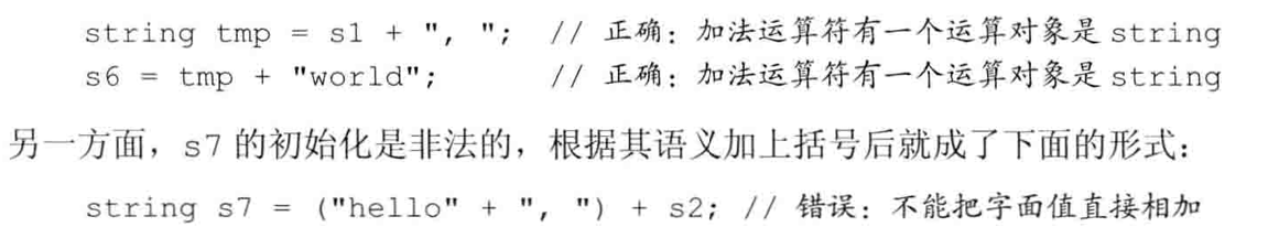 - 很容易看到,括号内的子表达式试图把两个字符串字面值加在一起,而编译器根本没法做到这一点,所以这条语句是错误的。