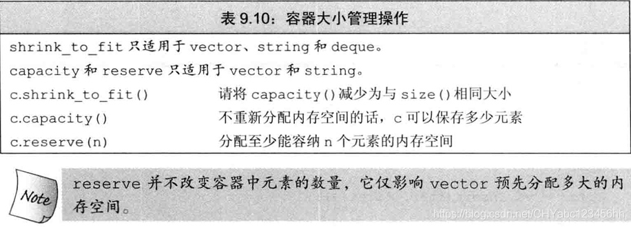 - 如表9.10所示,vector和string类型提供了一些成员函数,允许我们与它的实现中内存分配部分互动。capacity操作告诉我们容器在不扩张内存空间的情况下可以容纳多少个元素。reserve操作允许我们通知容器它应该准备保存多少个元素。