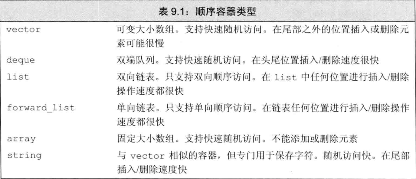 - 表9.1列出了标准库中的顺序容器,所有顺序容器都提供了快速顺序访问元素的能力。但是,这些容器在以下方面都有不同的性能折中: