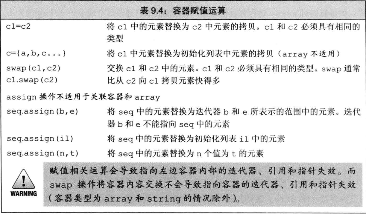 - 表9.4中列出的与赋值相关的运算符可用于所有容器。赋值运算符将其左边容器中的全部元素替换为右边容器中元素的拷贝: