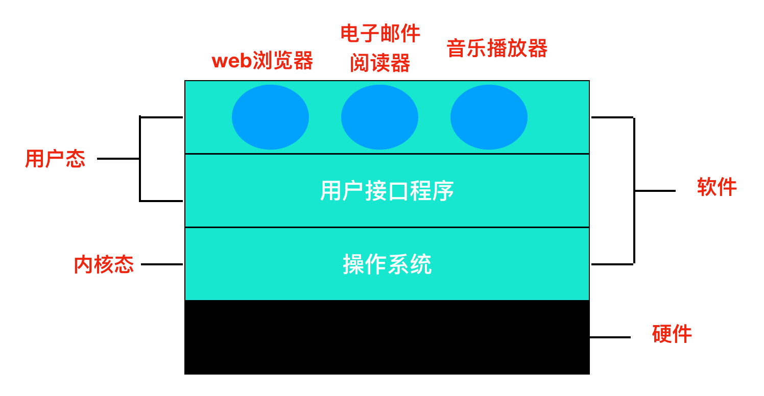 - 操作系统的简化图如上图所示,最下面的是硬件,硬件包括芯片、电路板、磁盘、键盘、显示器等,在硬件之上是软件。大部分计算机有两种运行模式:内核态 和 用户态,软件中最基 础的部分是操作系统,它运行在内核态 中,内核态也称为 管态和核心态,它们都是操作系统的运行状态,只不过是不同的叫法而已。操作系统具有硬件的访问权,可以执行机器能够运行的任何指令。