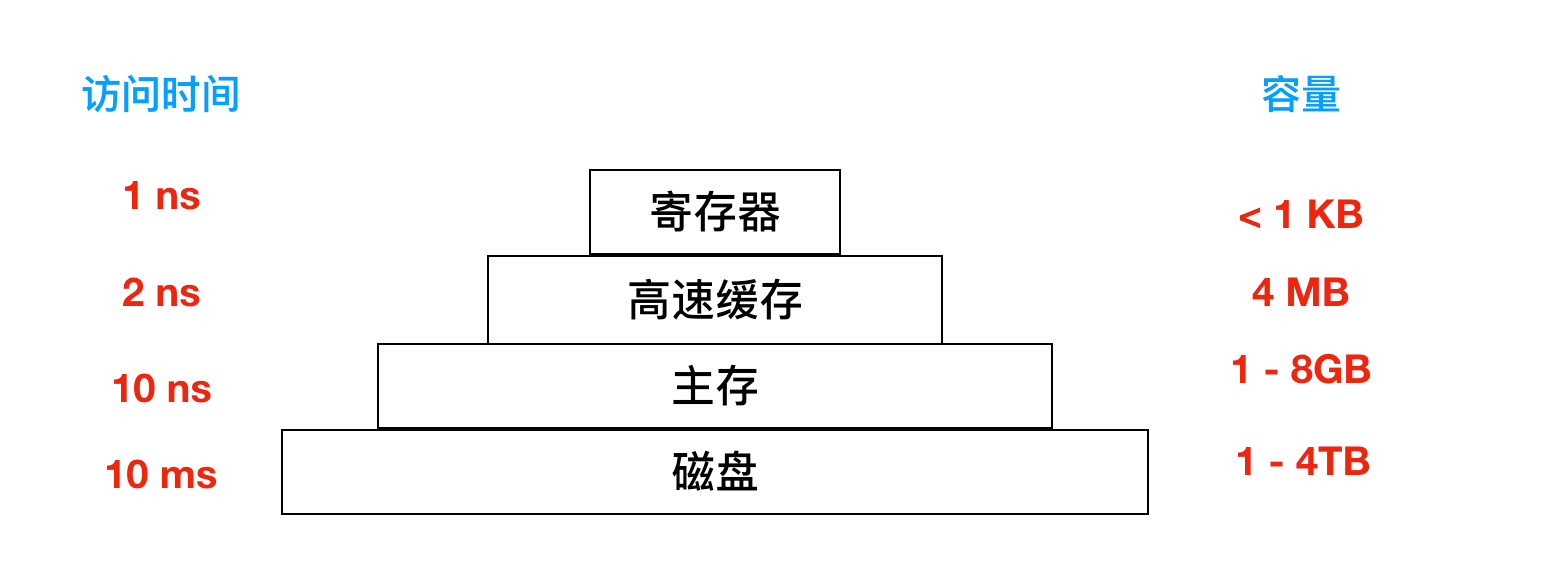 - 顶层的存储器速度最高,但是容量最小,成本非常高,层级结构越向下,其访问效率越慢,容量越大, 但是造价也就越便宜。