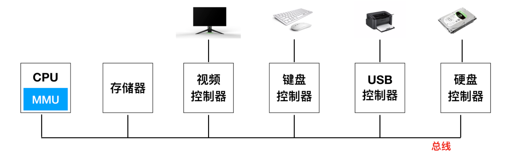 - CPU和存储器不是操作系统需要管理的全部,I/O设备也与操作系统关系密切。可以参考上面这个图片,I/O设备一般包括两个部分:设备控制器和设备本身。控制器本身是一块芯片或者一组芯片,它能够控制物理设备。它能够接收操作系统的指令,例如,从设备中读取数据并完成数据的处理。打印机接收用户输入的命令,打印文章