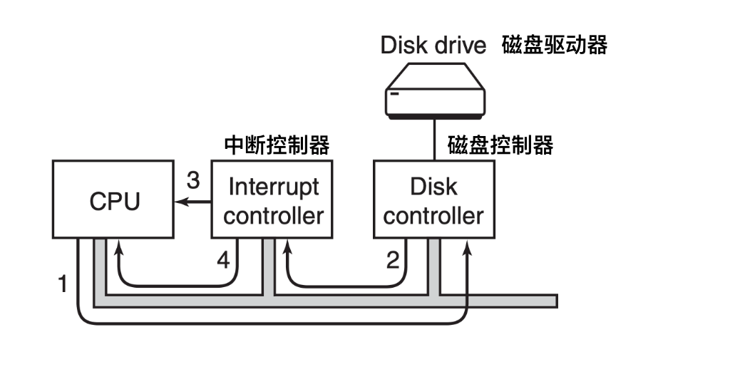 - 如上图所示,这是一个三步的I/O过程,第一步,设备驱动程序会通过写入设备寄存器告诉控制器应该做什么。然后,控制器启动设备。当控制器完成读取或写入被告知需要传输的字节后,它会在步骤2中使用某些总线向中断控制器发送信号。如果中断控制器准备好了接收中断信号(如果正忙于一个优先级较高的中断,则可能不会接收),那么它就会在CPU的一个引脚上面声明。这就是步骤3