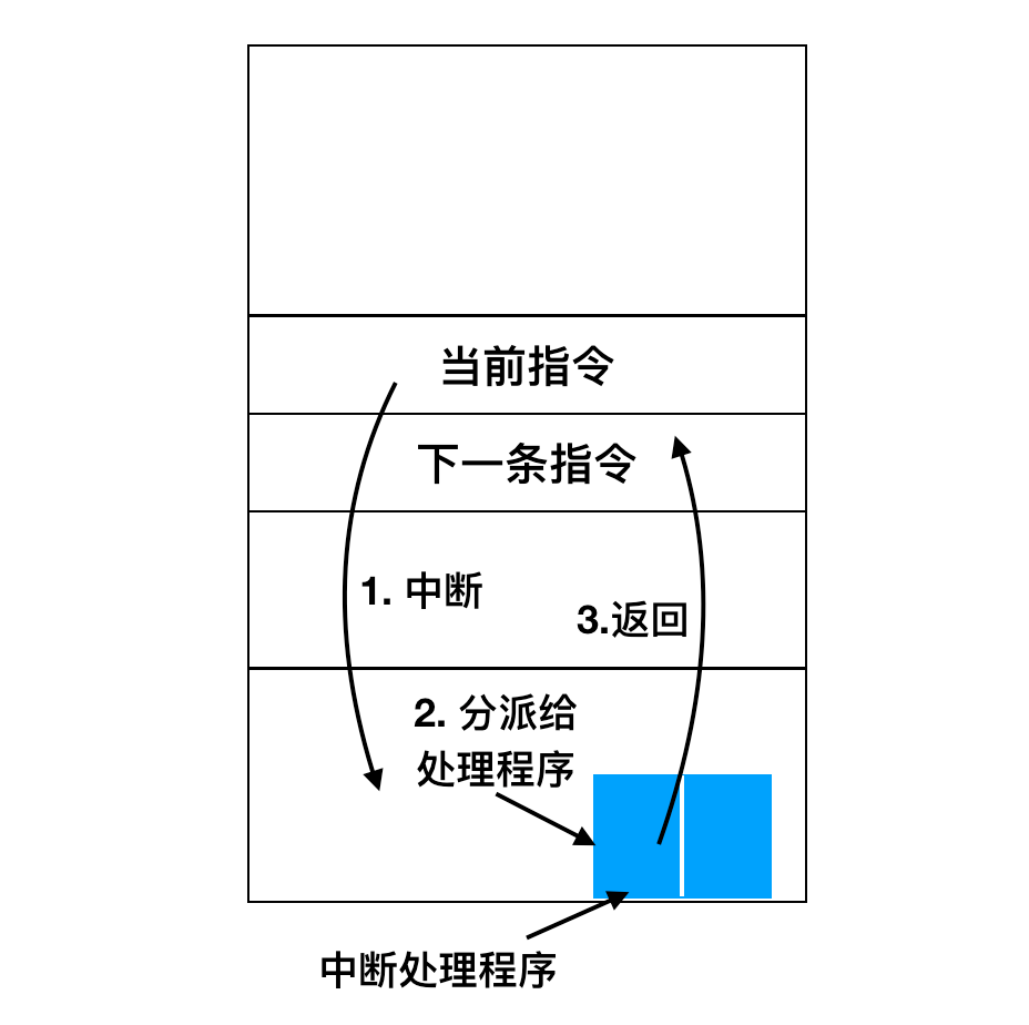 - 一旦CPU决定去实施中断后,程序计数器和PSW就会被压入到当前堆栈中并且CPU会切换到内核态。设备编号可以作为内存的一个引用,用来寻找该设备中断处理程序的地址。这部分内存称作中断向量(interruptvector)。一旦中断处理程序(中断设备的设备驱动程序的一部分)开始后,它会移除栈中的程序计数器和PSW寄存器,并把它们进行保存,然后查询设备的状态。在中断处理程序全部完成后,它会返回到先前用户程序尚未执行的第一条指令,这个过程如下