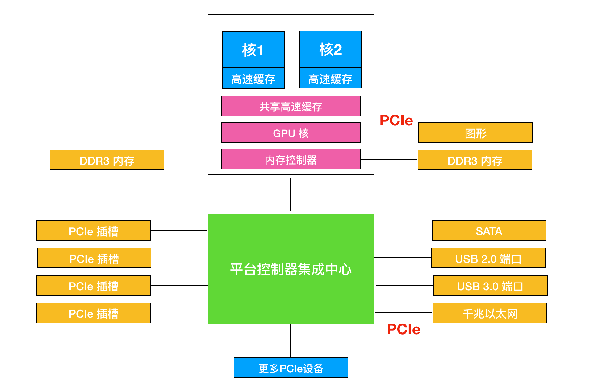 - 在上图结构中,CPU通过DDR3总线与内存对话,通过PCIe总线与外围图形设备(GPU)对话,通过DMI(DirectMediaInterface)总线经集成中心与所有其他设备对话。而集成控制中心通过串行总线与USB设备对话,通过SATA总线与硬盘和DVD驱动器对话,通过PCIe传输以太网络帧。