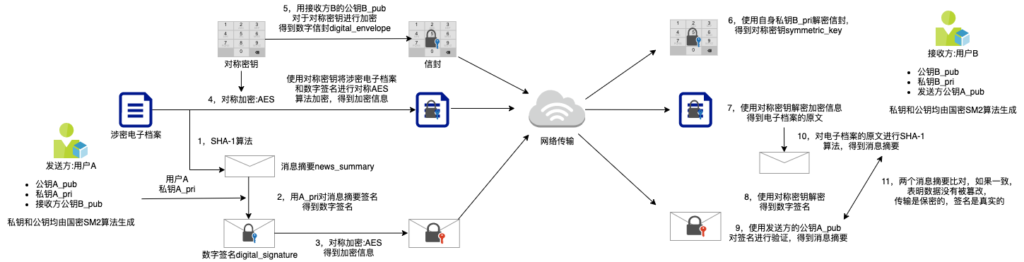 - 如果将对称密码算法和非对称密码算法的优点结合起来,则既能处理大批量数据,又能简化密钥的分发与管理,于是数字信封机制应运而生。采用数字信封技术后,即使加密文件被他人非法截获,因为截获者无法得到发送方的通信密钥,故不可能对文件进行解密。