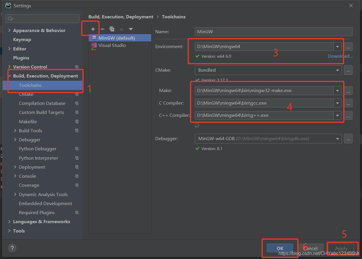 - 选择+号,点击MinGW,系统就会自动检索其下载配置的环境,如果检测不到,需要自己复制路径,粘贴到Environment后面。