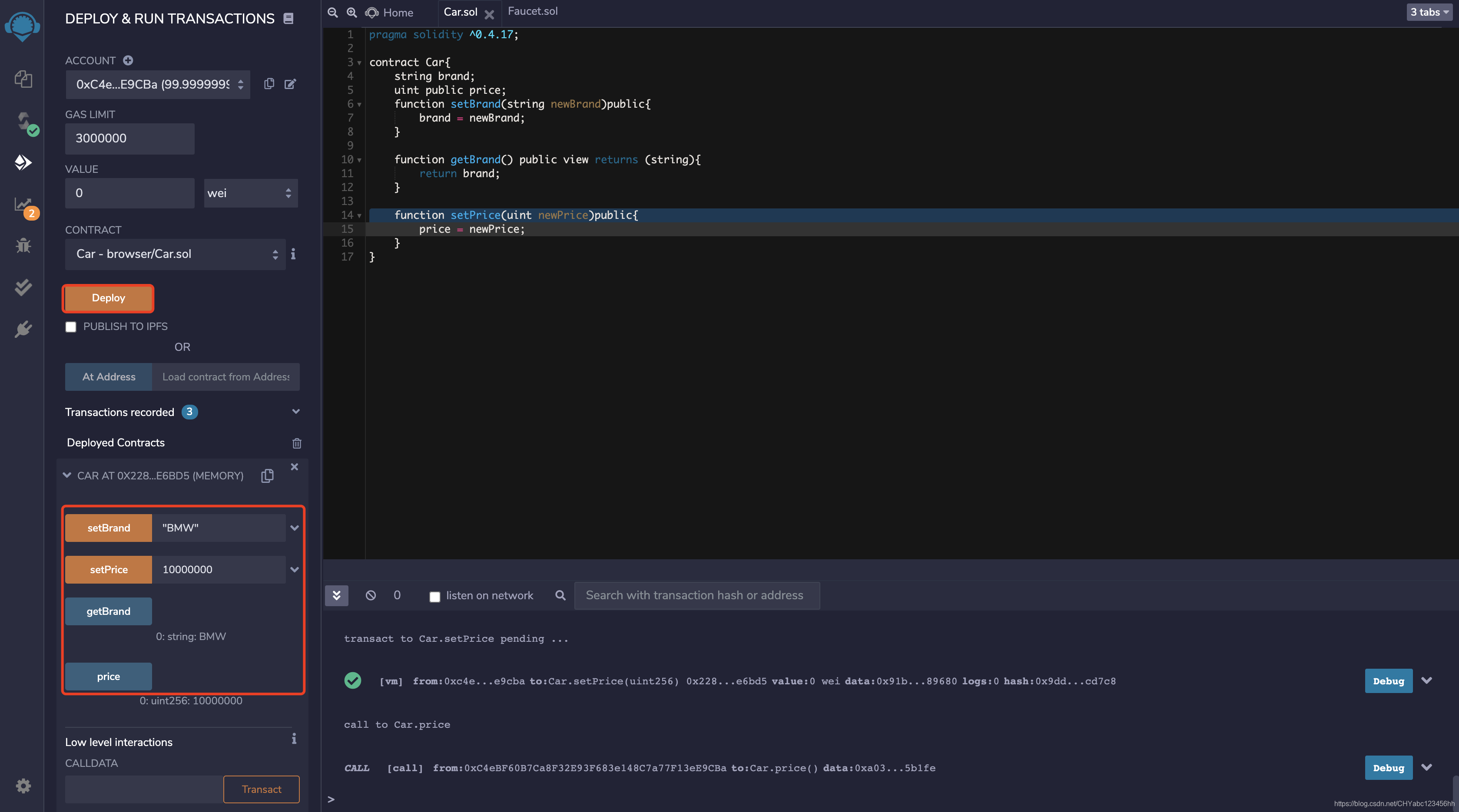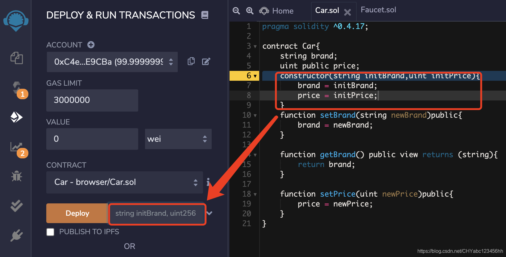 - 加入constructor进行初始化合约赋值,先输入品牌,价格再部署合约,赋予初始默认值