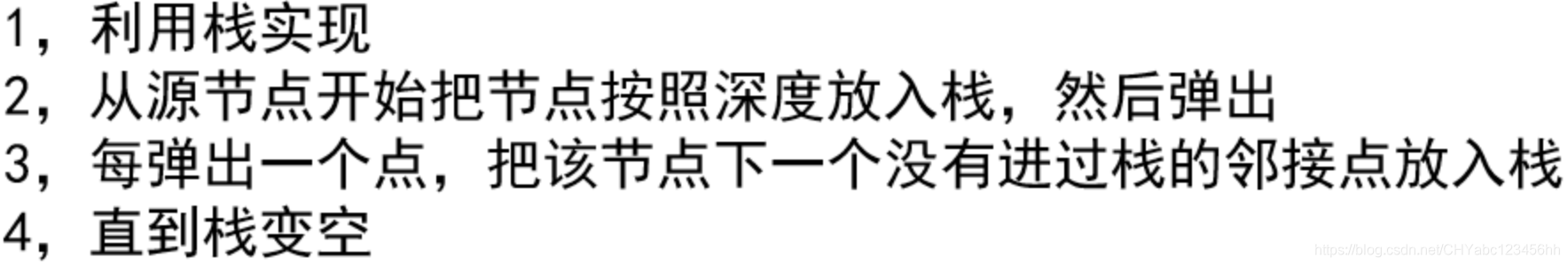 import java.util.Stack;public class Code02_DFS {public static void dfs(Node node) {if (node == null) {return;}Stack<Node> stack = new Stack<>();//保证深度的路径HashSet<Node> set = new HashSet<>();stack.add(node);set.add(node);System.out.println(node.value);while (!stack.isEmpty()) {Node cur = stack.pop();for (Node next : cur.nexts) {if (!set.contains(next)) {stack.push(cur);stack.push(next);set.add(next);System.out.println(next.value);break;}}}}}