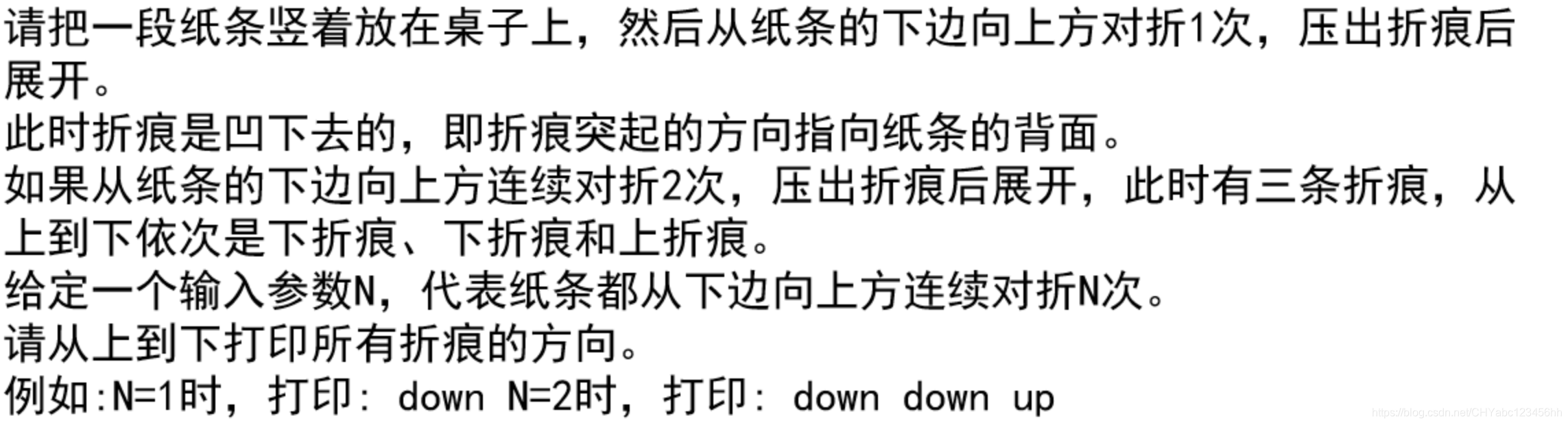 package class05;public class Code10_PaperFolding {public static void printAllFolds(int N) {printProcess(1, N, true);}// 递归过程,来到了某一个节点,// i是节点的层数,N一共的层数,down == true  凹    down == false 凸public static void printProcess(int i, int N, boolean down) {if (i > N) {return;}printProcess(i + 1, N, true);System.out.println(down ? "凹 " : "凸 ");printProcess(i + 1, N, false);}public static void main(String[] args) {int N = 3;printAllFolds(N);}