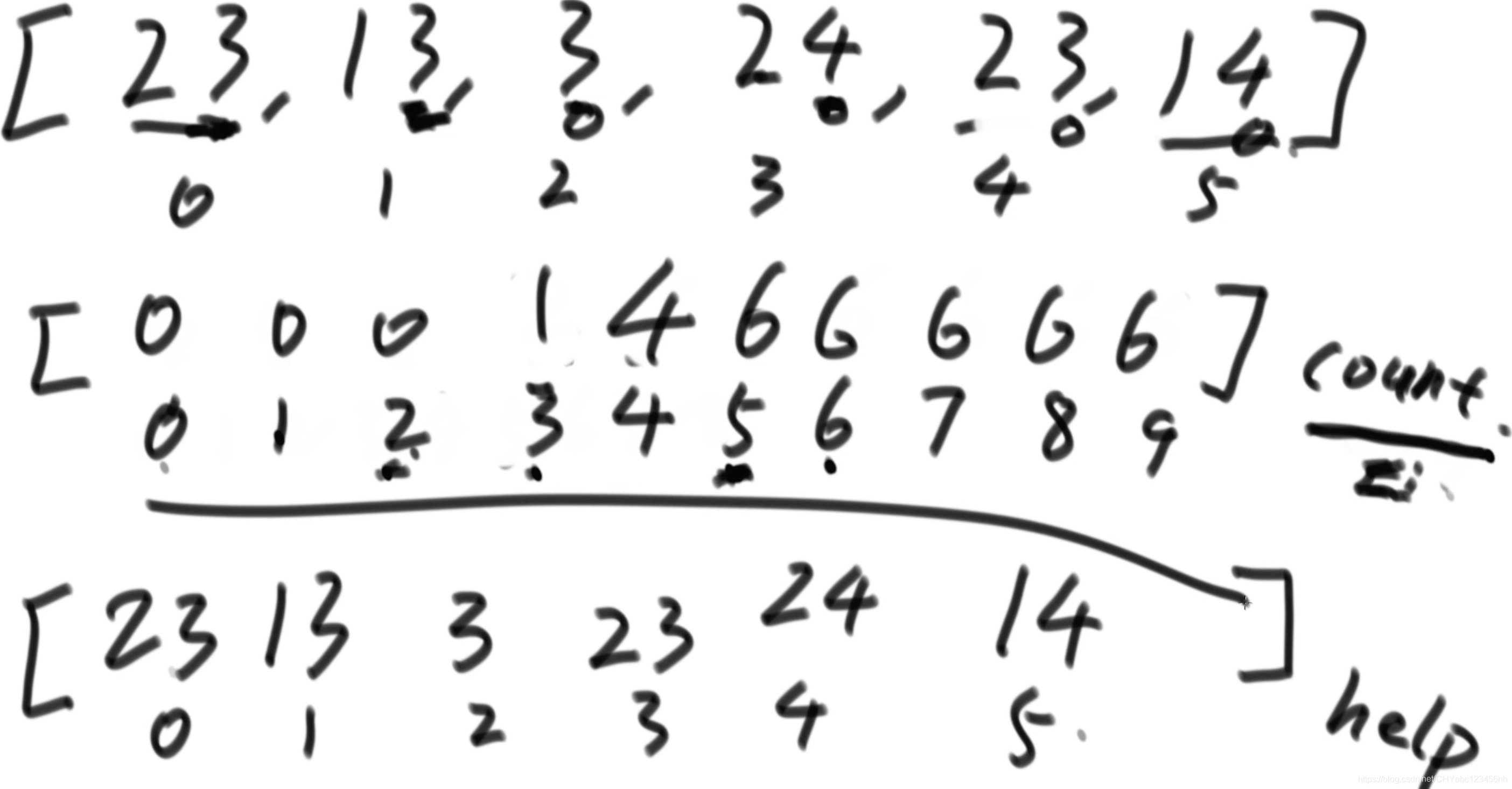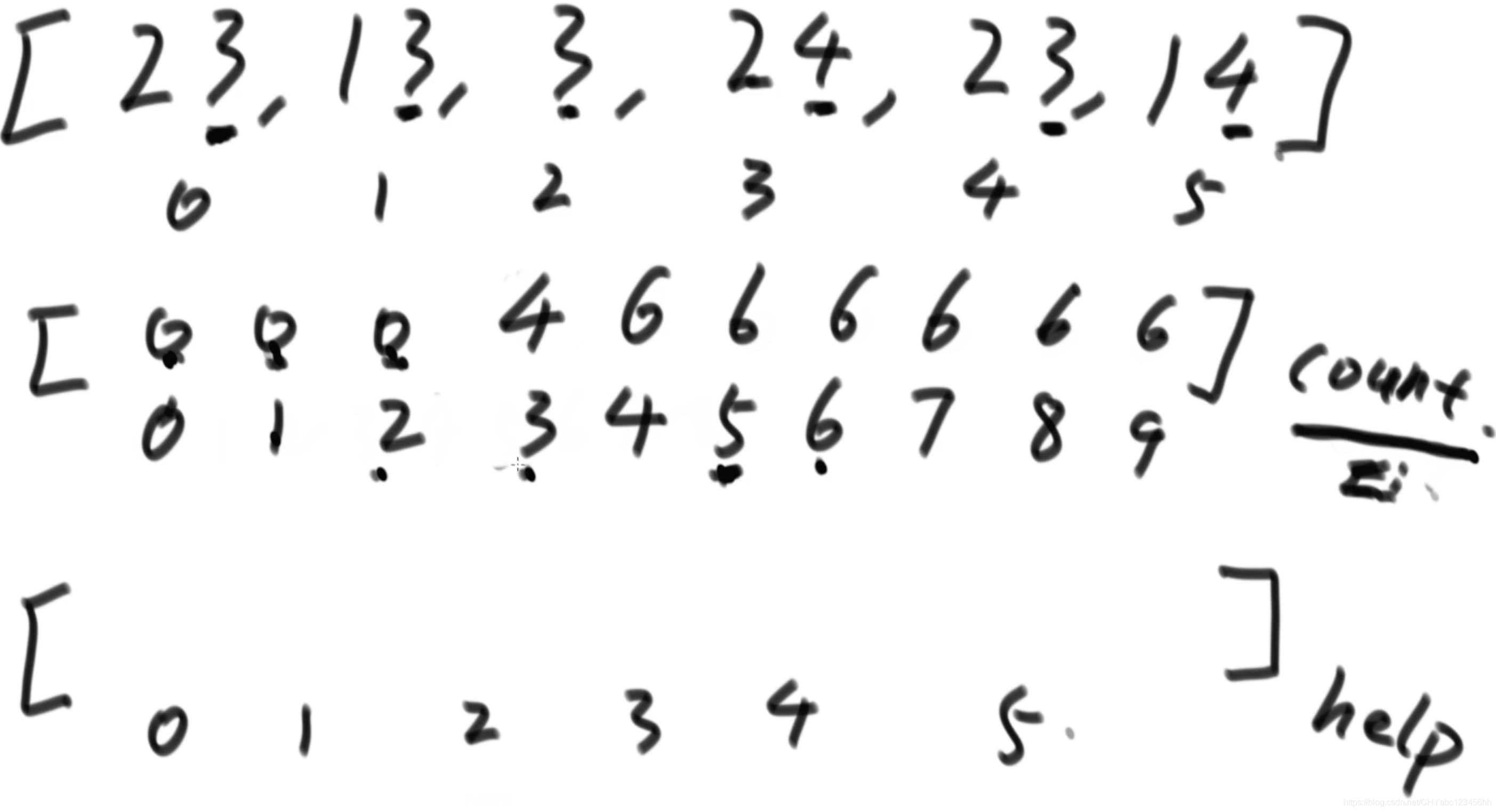 - 下一个元素是23, 个位元素对应的是3,查询count数组,小于等于3的元素有1个,因此将3填写在help数组的0号位置,count中3号位置的1减1;