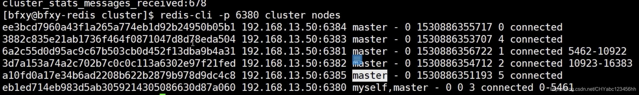 - CLUSTER nodes查看集群的节点,前面的字符串是集群ID,在redis-cli里面进行操作