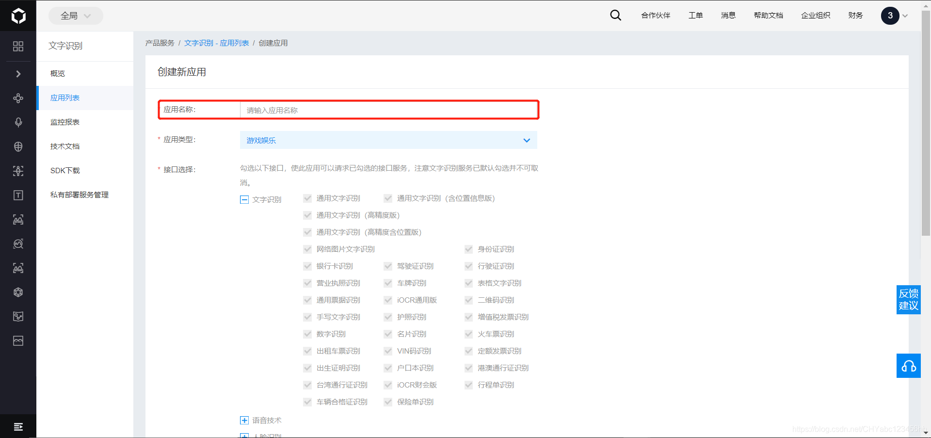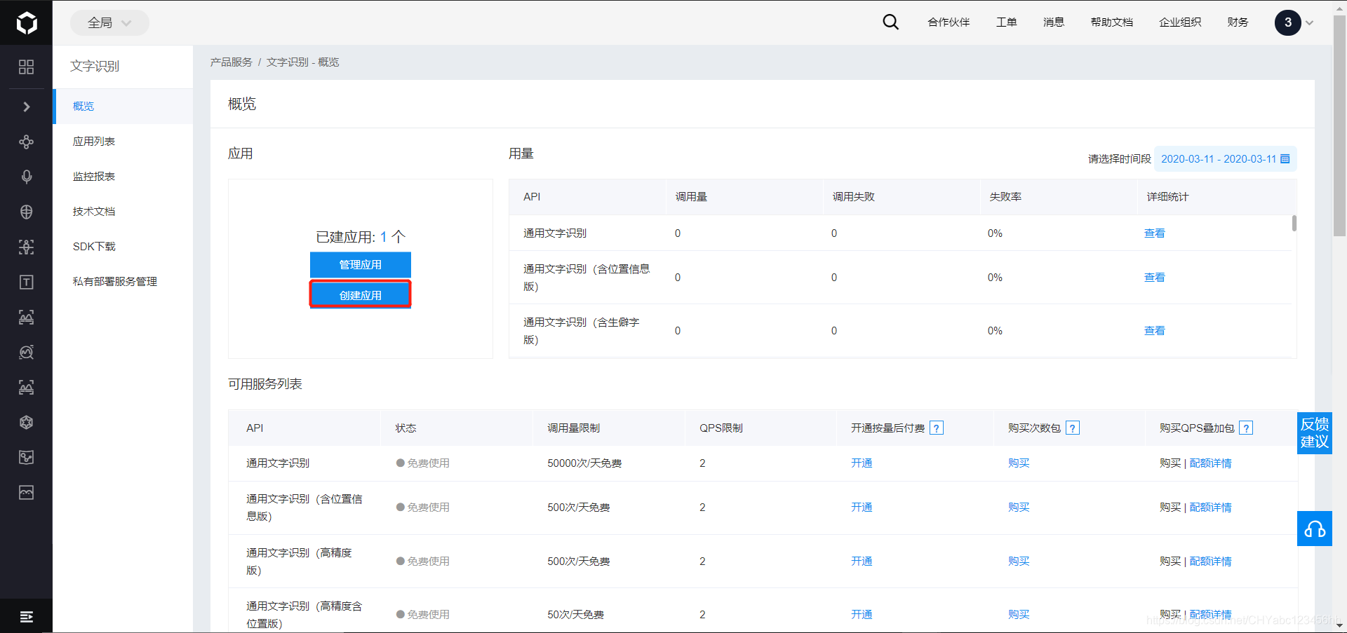 - 找到创建应用的选项,进行ocr项目的创建